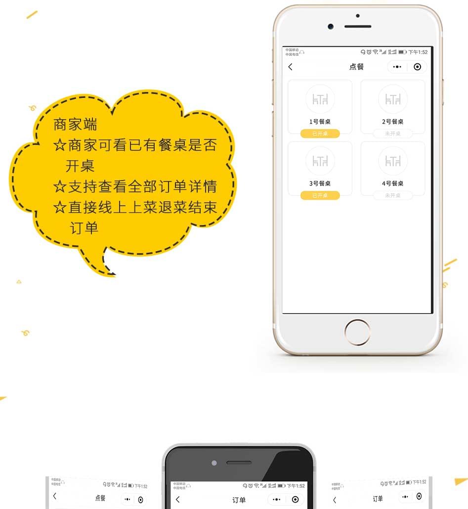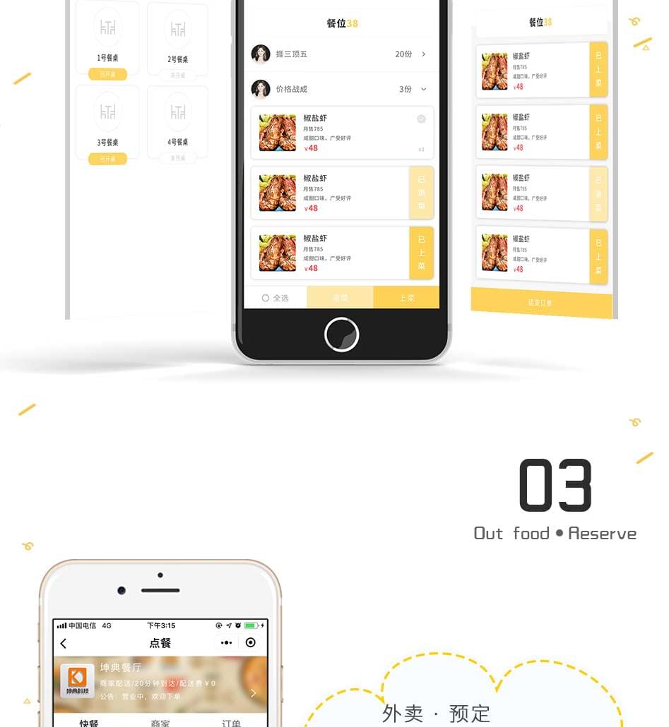 单店外卖、多店营销、商家展示、商家定位、订单提醒、模板消息、扫码点餐、预约桌位、预定菜品、扫码付款、在线点餐、分销系统、排队取号、支付收银、商家入驻、打印机支持、会员卡、优惠券功能、报表统计、积分商城、余额充值、店铺评论